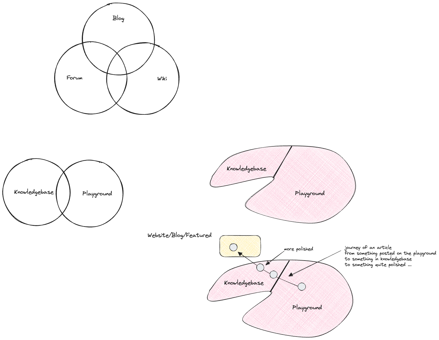 I like the idea of mixing a knowledgebase with a playground. The latter is more formal and the latter relaxed and, well, playful.