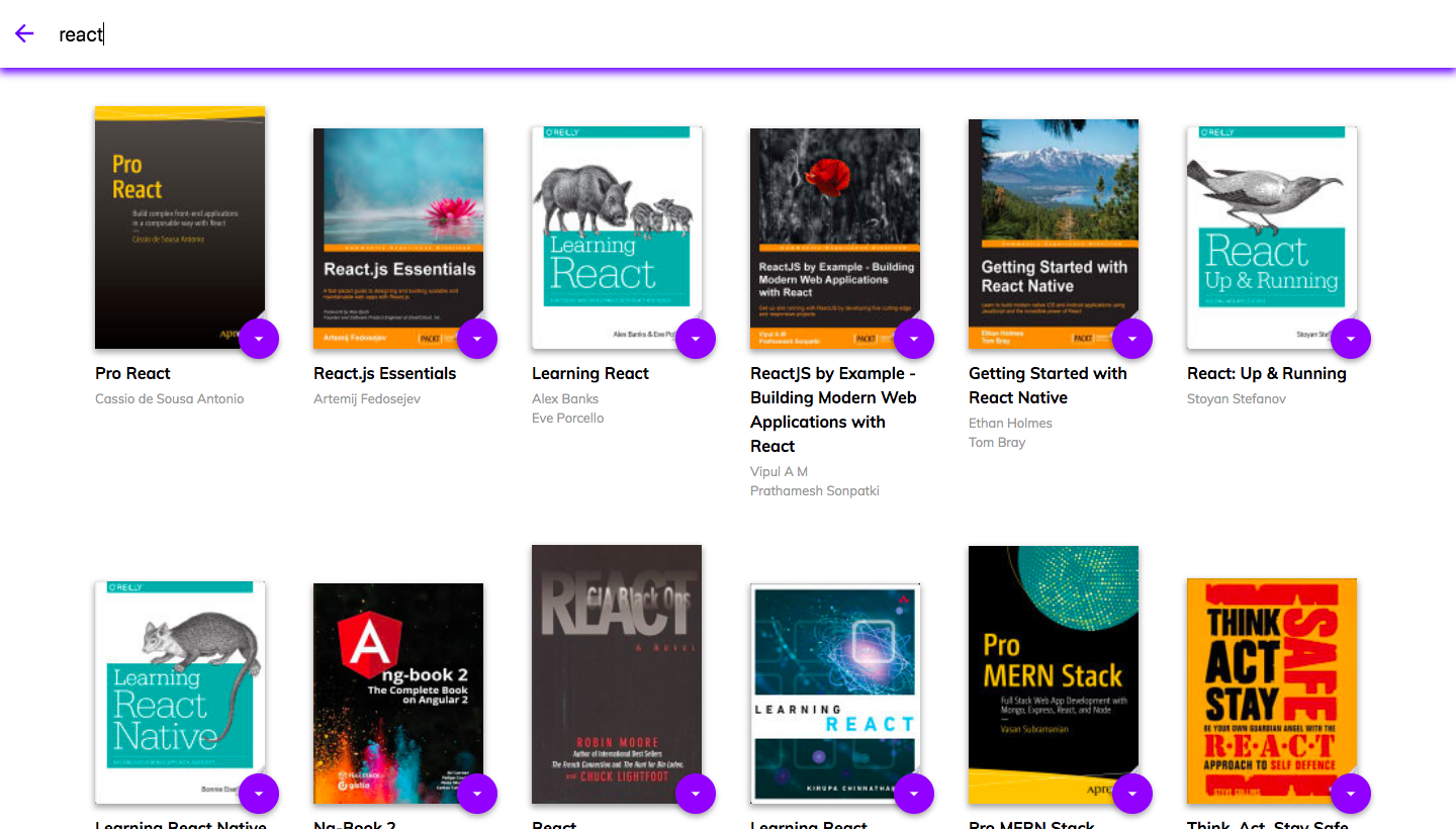 Click on the plus floating action button to navigate to the search page. Type in the name of a topic or category (e.g. poetry, history, artificial intelligence, web development, react) and a list of books belonging to that category will be fetched from the server. The API call is debounced using lodash debounce in order to improve performance. Clicking on the back arrow will navigate you back to the homepage.