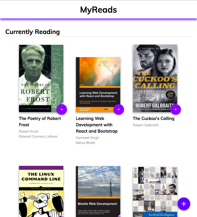 The homepage consists of three shelves - Currently Reading, Want to Read, and Read. Books in a bookshelf are arranged in a grid that is implemented using CSS Grids.