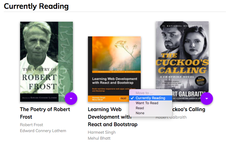 Just like in the homepage, click on the option icon located at the bottom right of a book to view a list of available shelves. Use it to move the book into the corresponding bookshelf in the home screen. When a book is already in a bookshelf, the corresponding value will be selected in the control.