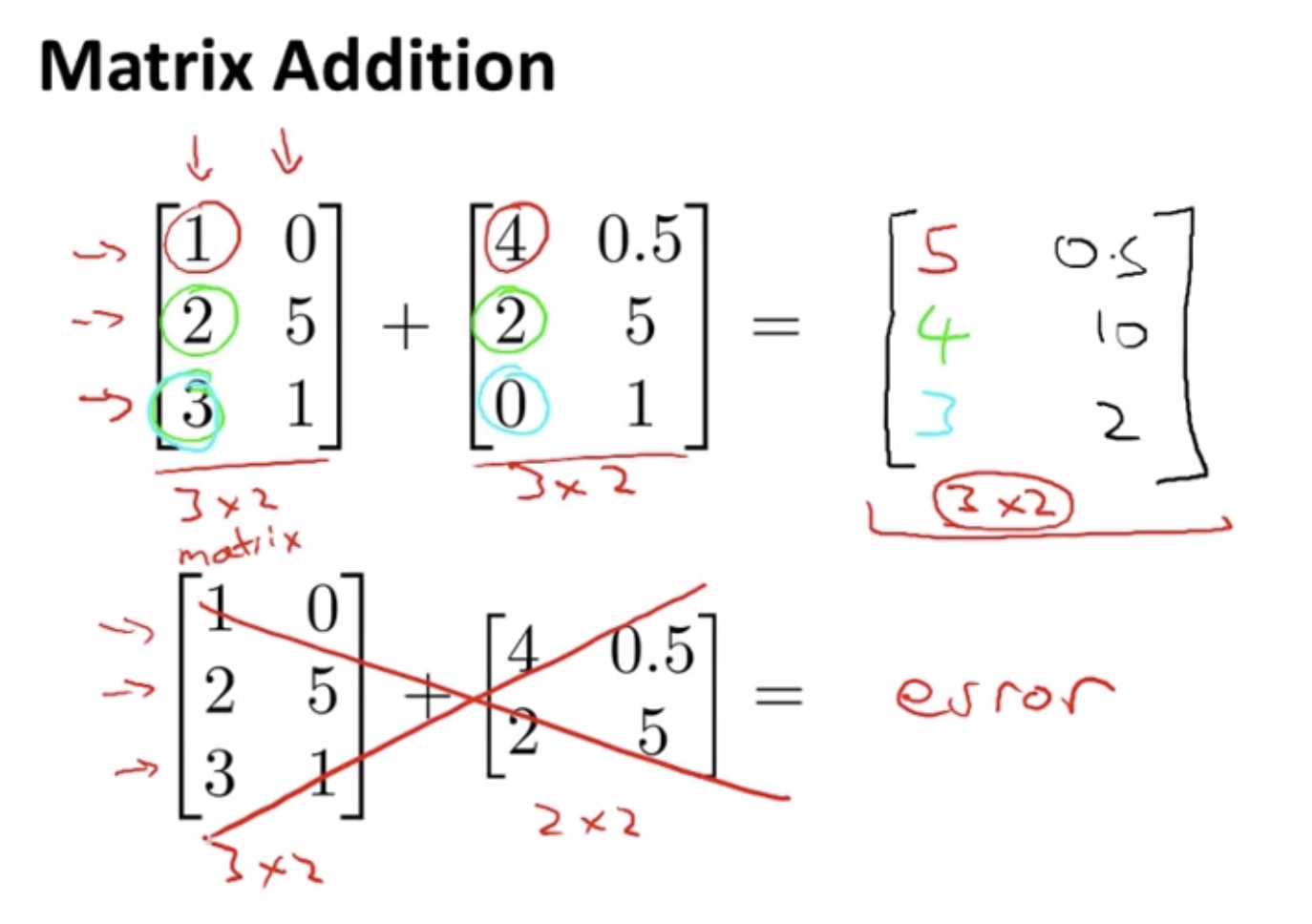 - 행렬의 덧셈은 같은 크기의 행렬에서만 가능하며, 각 행열에 해당하는 원소끼리 더한다.