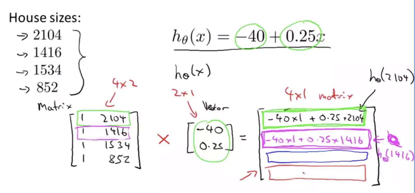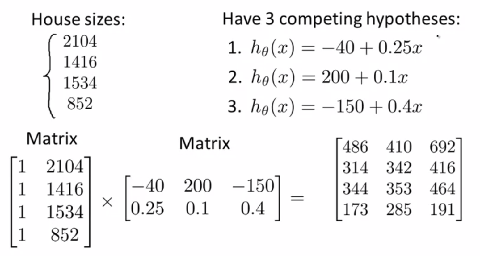 - 행렬과 벡터의 곱셈을 집 가격을 예측하는 가설함수에도 사용할 수 있다.