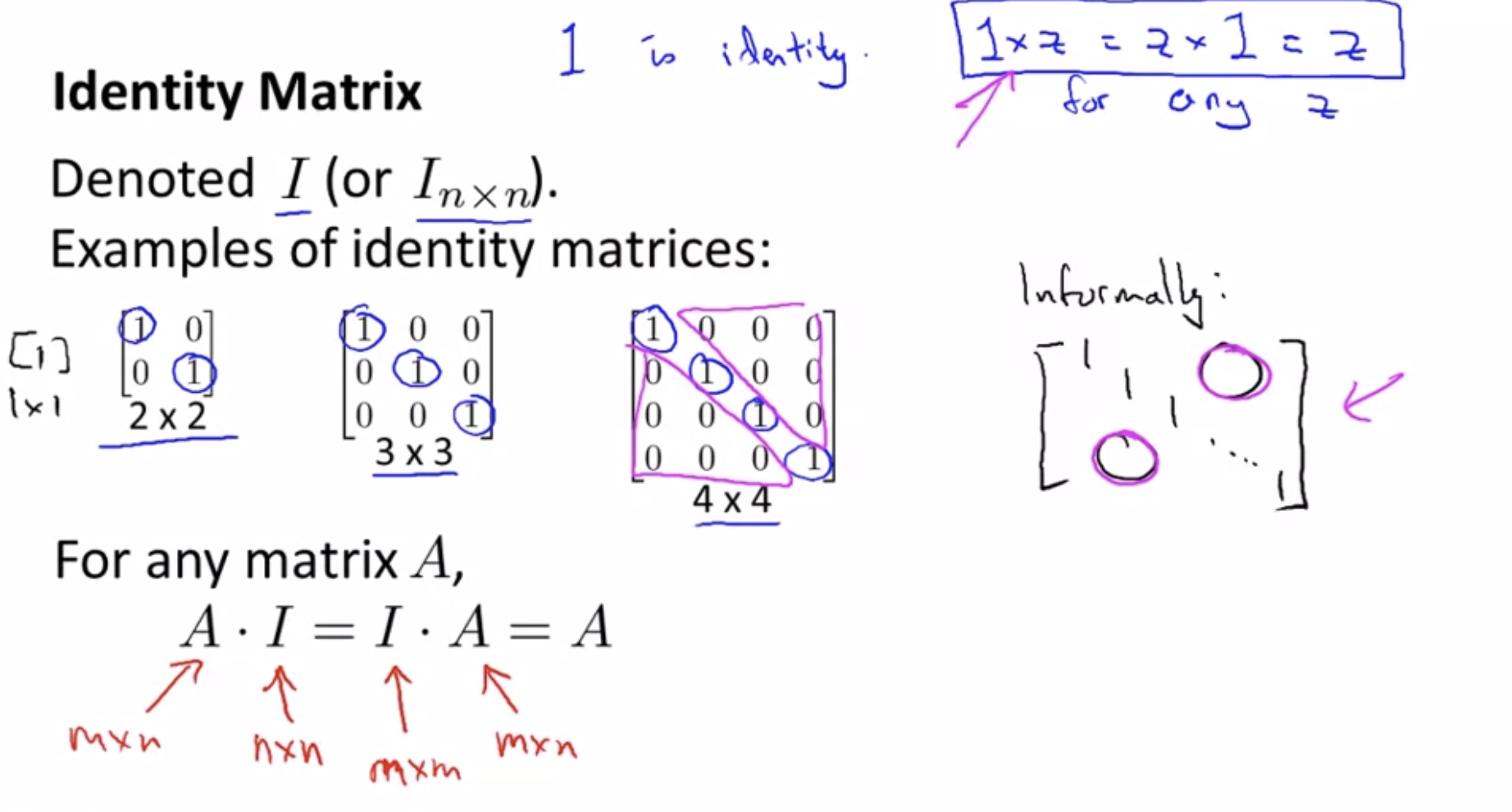 - 항등행렬 : IxA = AxI. I로 표시함. 대각선이 1이고 나머지는 0으로 채워져있다.
