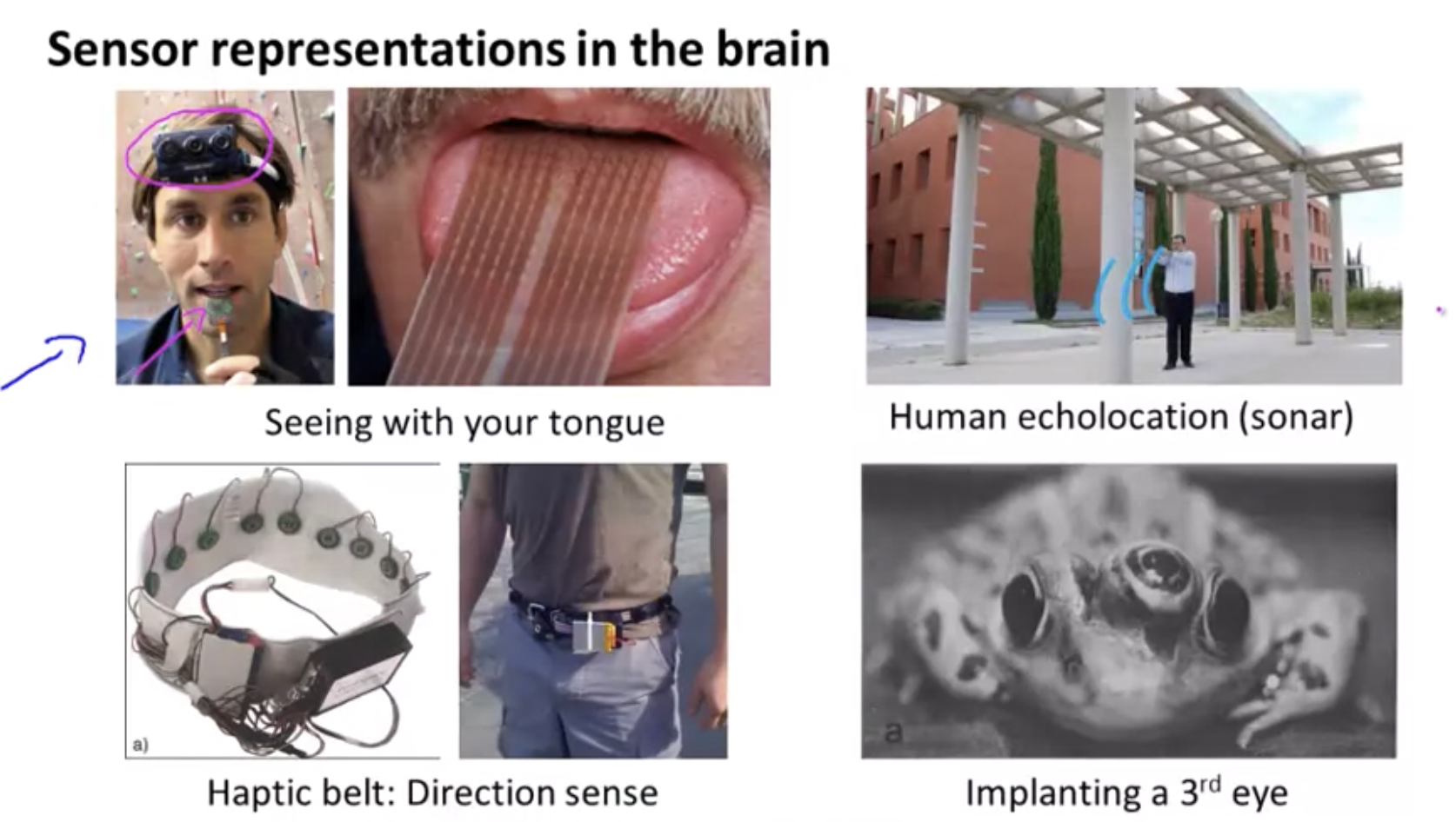 - 실제사례 : 혀에 전극을 연결하여 보는법을 배운 시각장애인, 소리를 통해 앞을 볼수있게된 눈이없는 아이, 개구리에게 제 3의눈을 연결하여 그 눈의사용법을 터득한 경우 등등