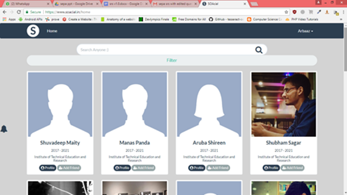 Students of SOA University do not have a platform where they can connect with other students and alumni of SOA University . The other social networking websites/apps that already exist allow everyone irrespective of their institute/university to create their profiles. This approach increases complexity and students often find difficulties in finding out people who belong to their institute/university. Moreover, students struggle to connect with alumni of their institute, who can help them regarding many job opportunities.