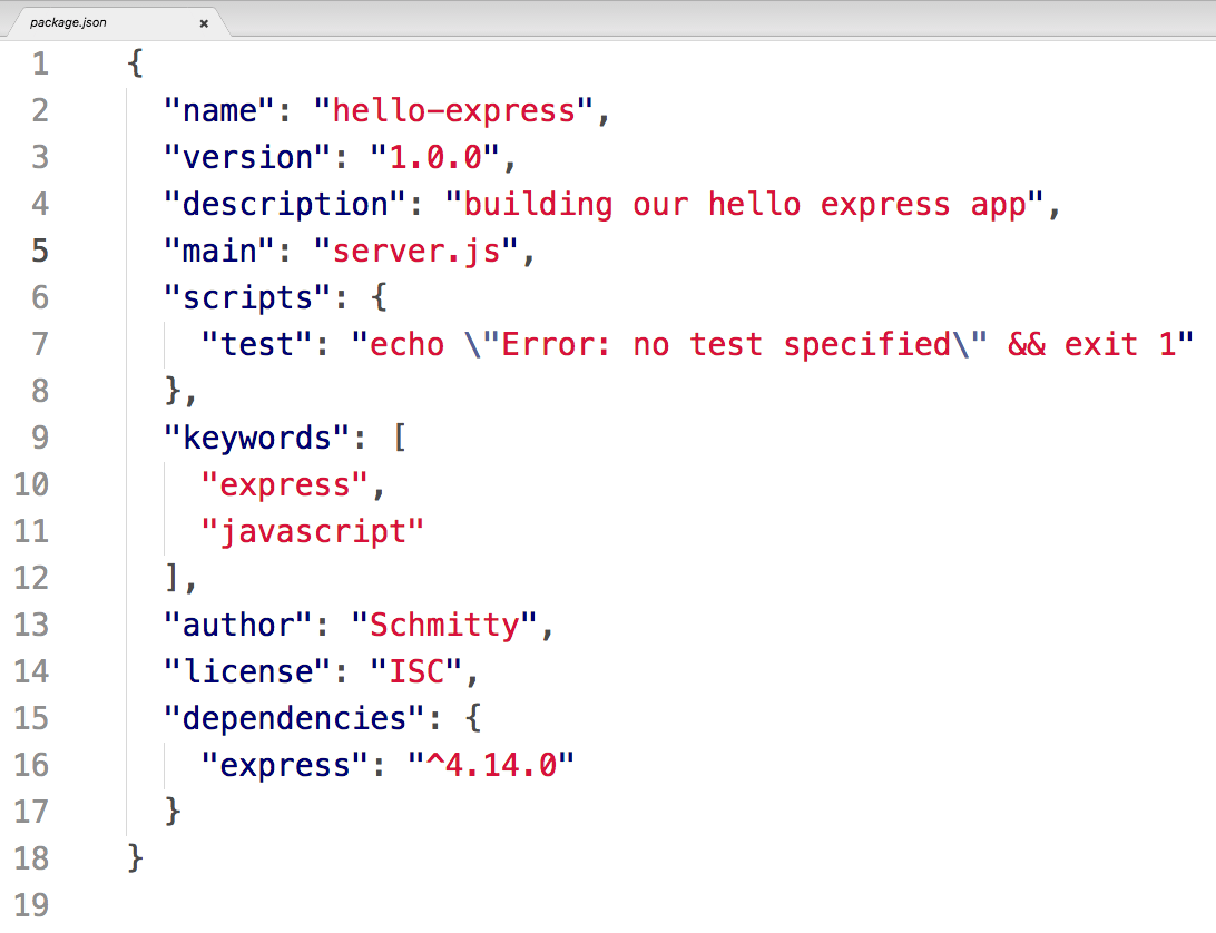 server.js) and we take a look at the contents of thepackage.jsonfile, we'll see something like this: