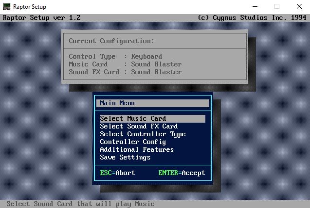 Creates and edits the SETUP.INI config file for Raptor Call Of The Shadows DOS versions and with additional features for the reverse-engineered source port Raptor as well. This tool based on the awesome libtextscreen from chocolate-doom.