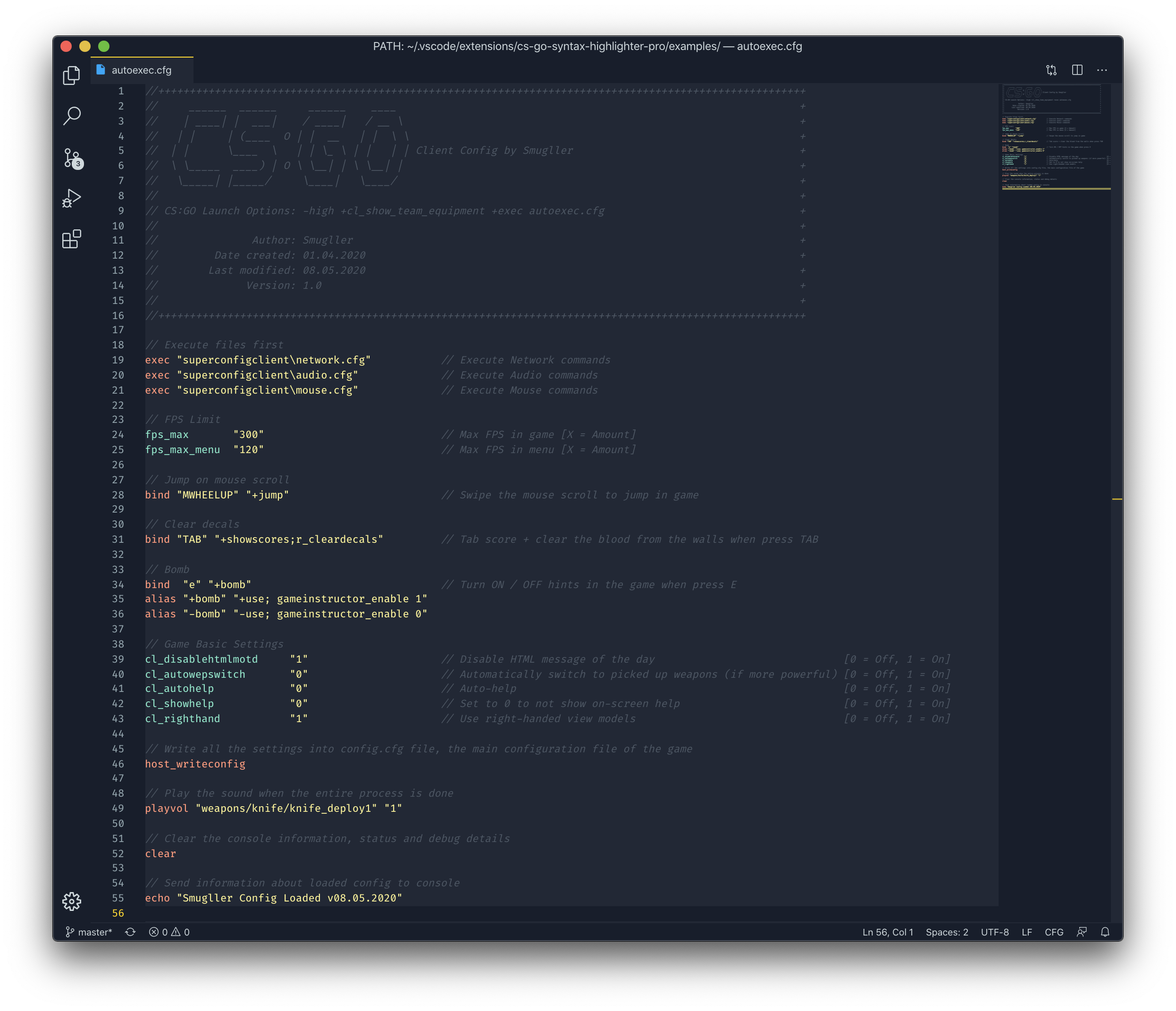 This extension add support for .cfg files in Visual Studio Code and making a beautiful syntax highlighting for Valve games like CS:GO or Team Fortress 2 etc.