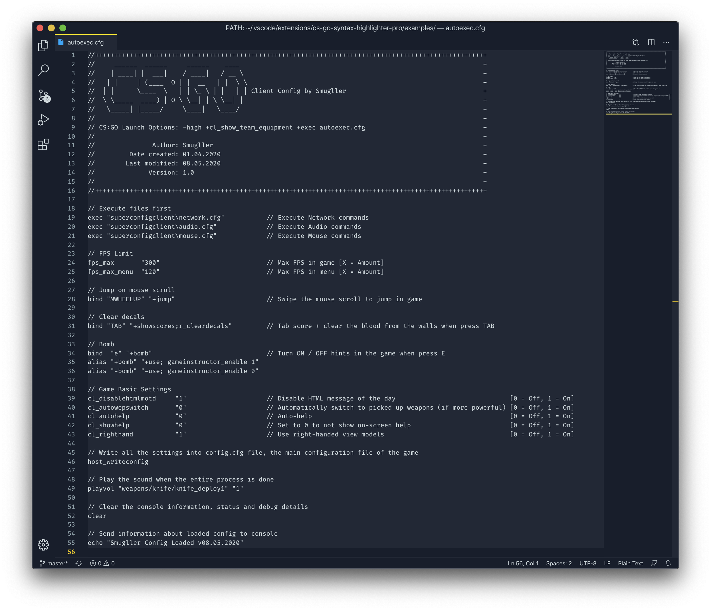 With this extensions I will add the examples folder, so you can test this plugin on your computer. Just open file autoexec.cfg from directory $HOME/.vscode/extensions/cs-go-syntax-highlighter-pro/examples/autoexec.cfg and Select Language Mode in VSCode or Configure File Association for '.cfg' ... files.