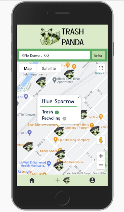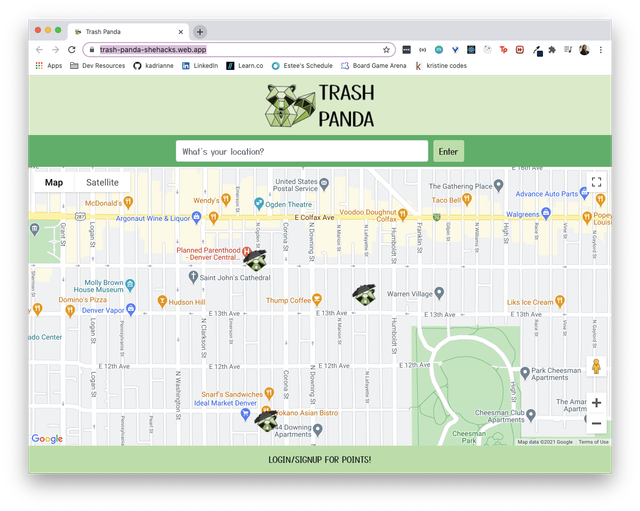 Trash Panda is a Progressive Web App that aims to make it easier for people to recycle and throw away trash rather than littering. The app displays an interactive map where the users can view all of the closest recycling bins and trash locations convenient to them. The locations are represented by our extremely cute mascot, the Trash Panda himself. The recycling/trash locations are crowd-sourced, so a user can also add a new trash/recycling location for others to utilize.