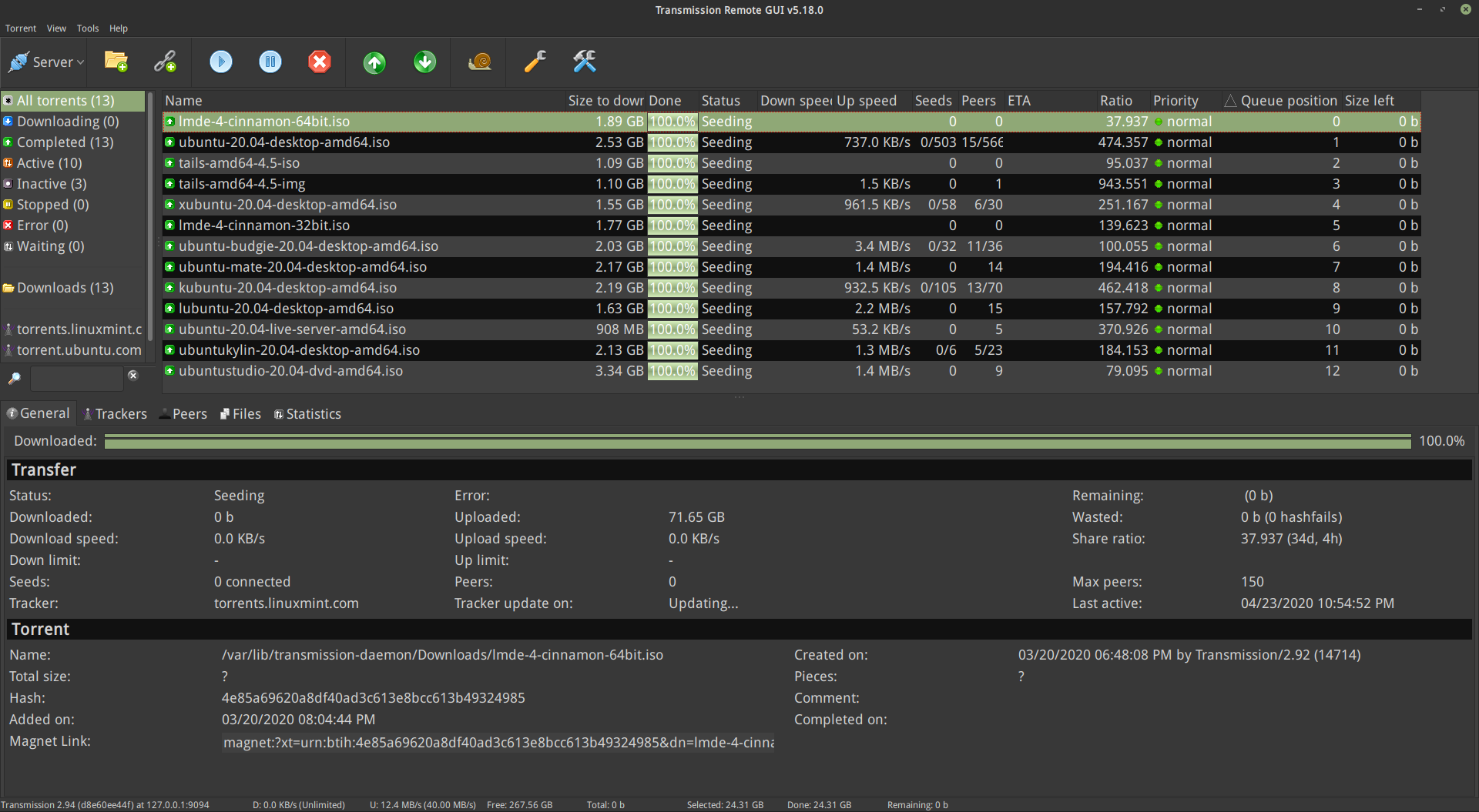 Transmission Remote GUI is feature rich cross platform front-end to remotely control Transmission daemon via its RPC protocol. It is faster and has more functionality than builtin Transmission web interface.