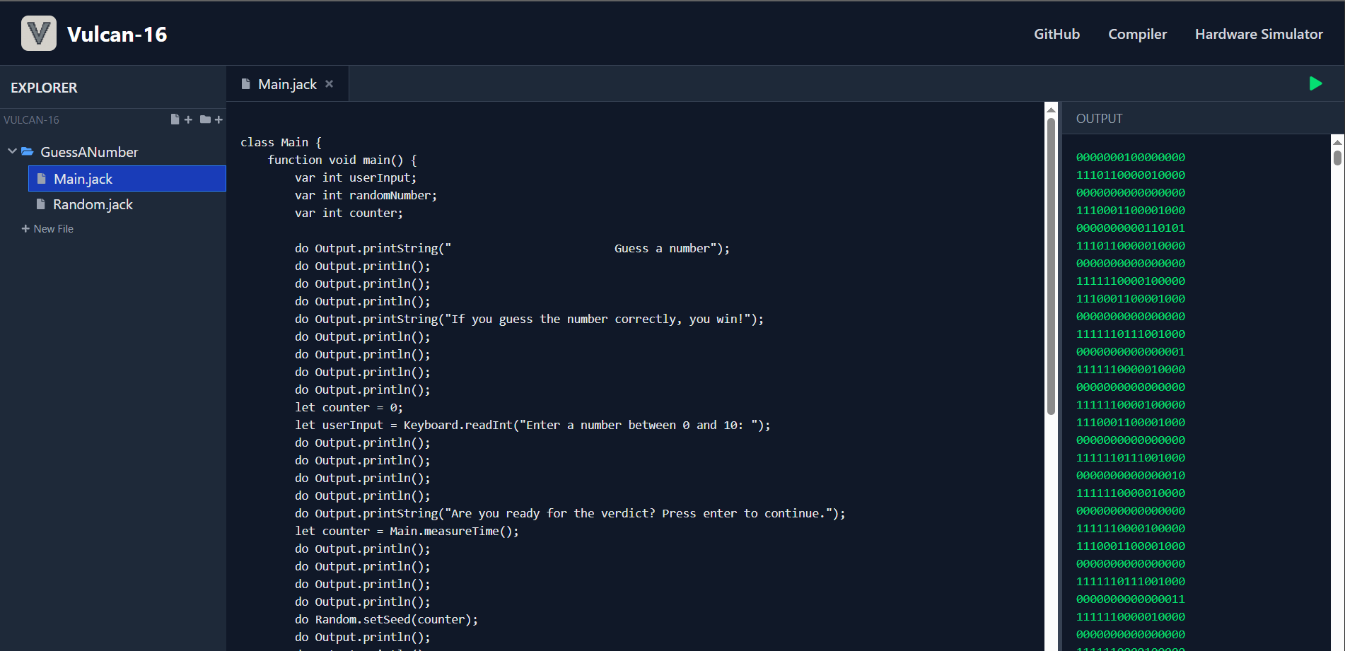 └── Games/ # GuessANumberI have created a web-based IDE Vulcan-16 IDE which has two main features: Compiler and Hardware Simulator.