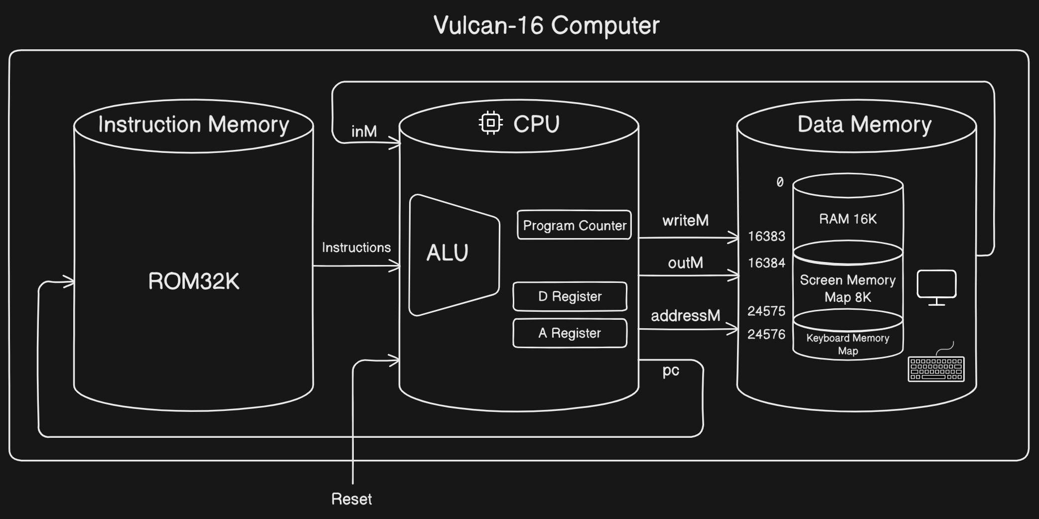 I have always wondered, "What is a computer?" Since childhood, I’ve treated it as a black box. I knew its components: the CPU, input devices, output devices—and their purposes, but I never truly understood how a computer actually works. How does a CPU, which supposedly only understands 1s and 0s, handle code? How does typing print("Hello World!") light up thousands of pixels on the screen? What happens inside the CPU when you write something as simple as x = 5? To answer these questions, my curiosity led me to build Vulcan-16.